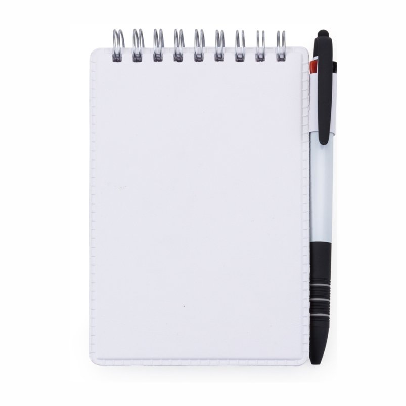 Bloco de anotações de couro sintético com suporte para caneta, frente e verso liso. Abertura superior, possui espiral prata e acompanha aproximadamente 95 folhas brancas sem pauta e suporte na lateral direita para caneta(não acompanha).