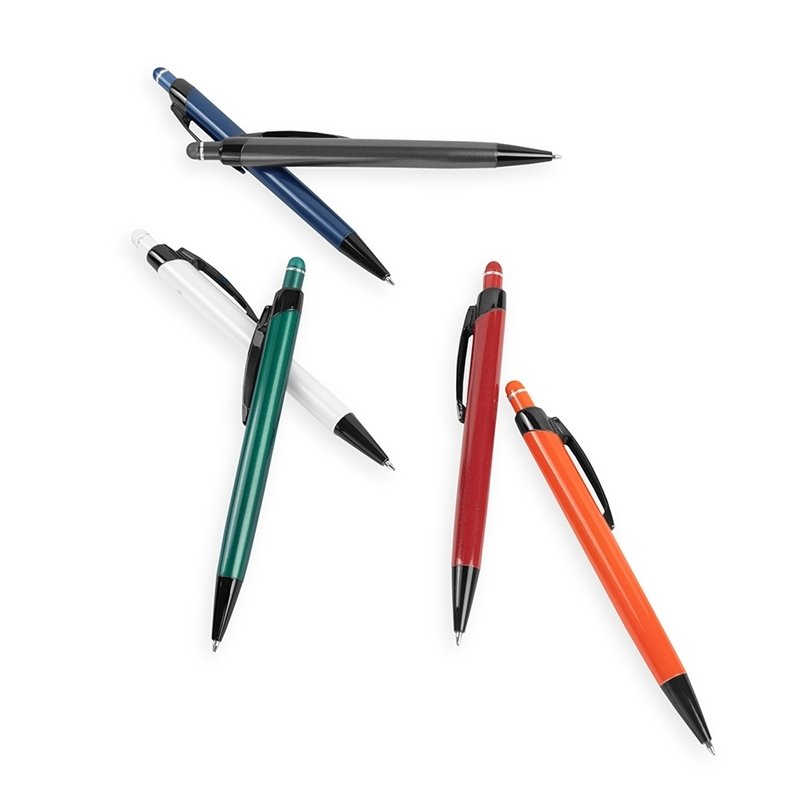 Caneta metálica com ponteira em plástico, além de detalhe emborrachado no topo para interação com dispositivos de telas sensíveis ao toque. Possui acabamento brilhante e conta com acionamento por clique e carga esferográfica azul de 1,0 mm.