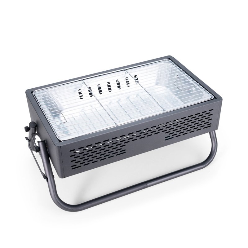 Churrasqueira em ferro com aberturas para ventilação e pés montáveis, que também podem ser utilizados como alças para transporte quando a churrasqueira não estiver em uso. Conta ainda com grelha em metal galvanizado e bandeja metálica com alças removíveis para acomodação do carvão.