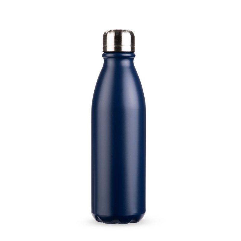 Garrafa em alumínio com acabamento em verniz fosco, revestimento plástico no bocal e capacidade para até 750ml. Possui tampa rosqueável em alumínio com interior em plástico.